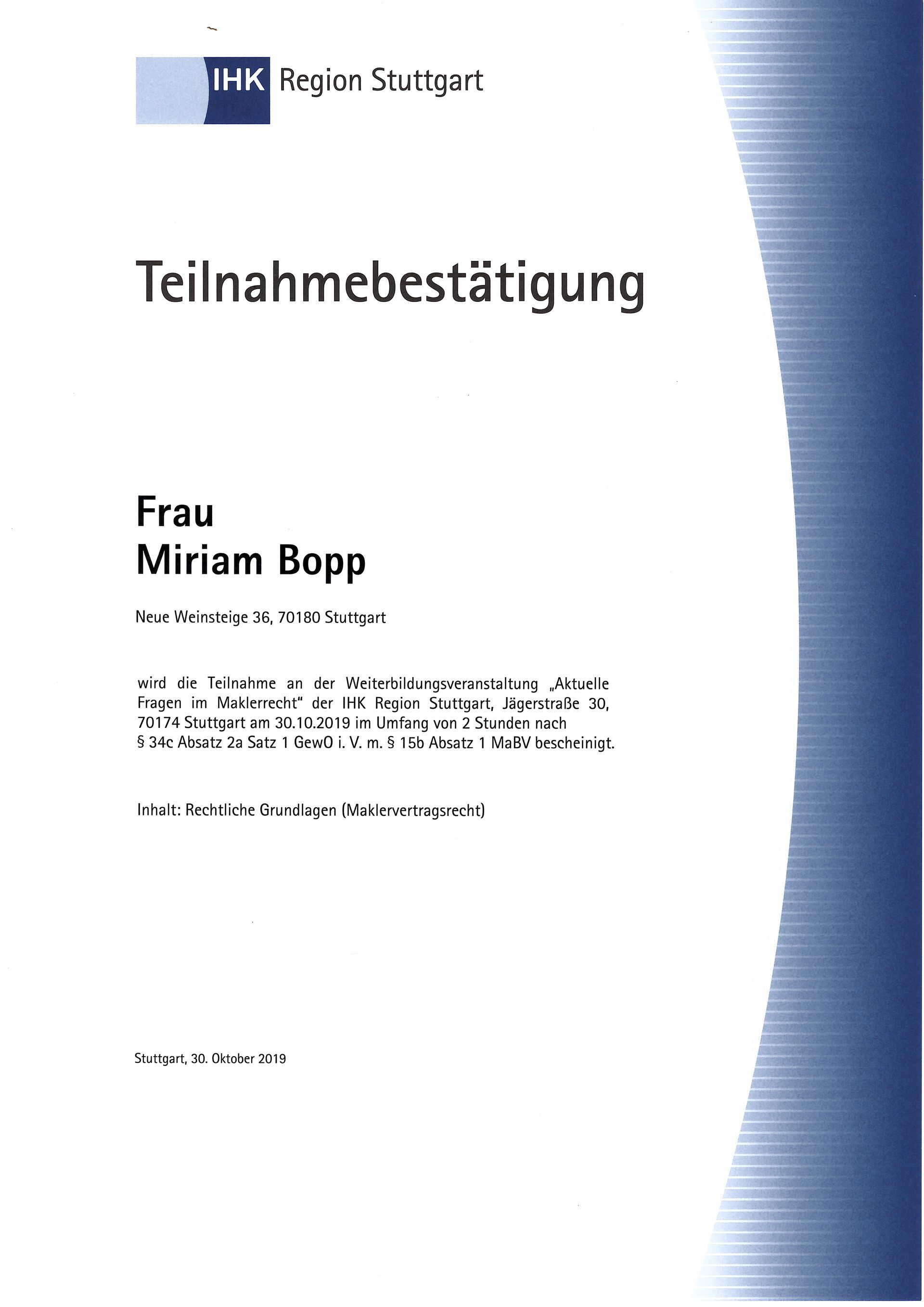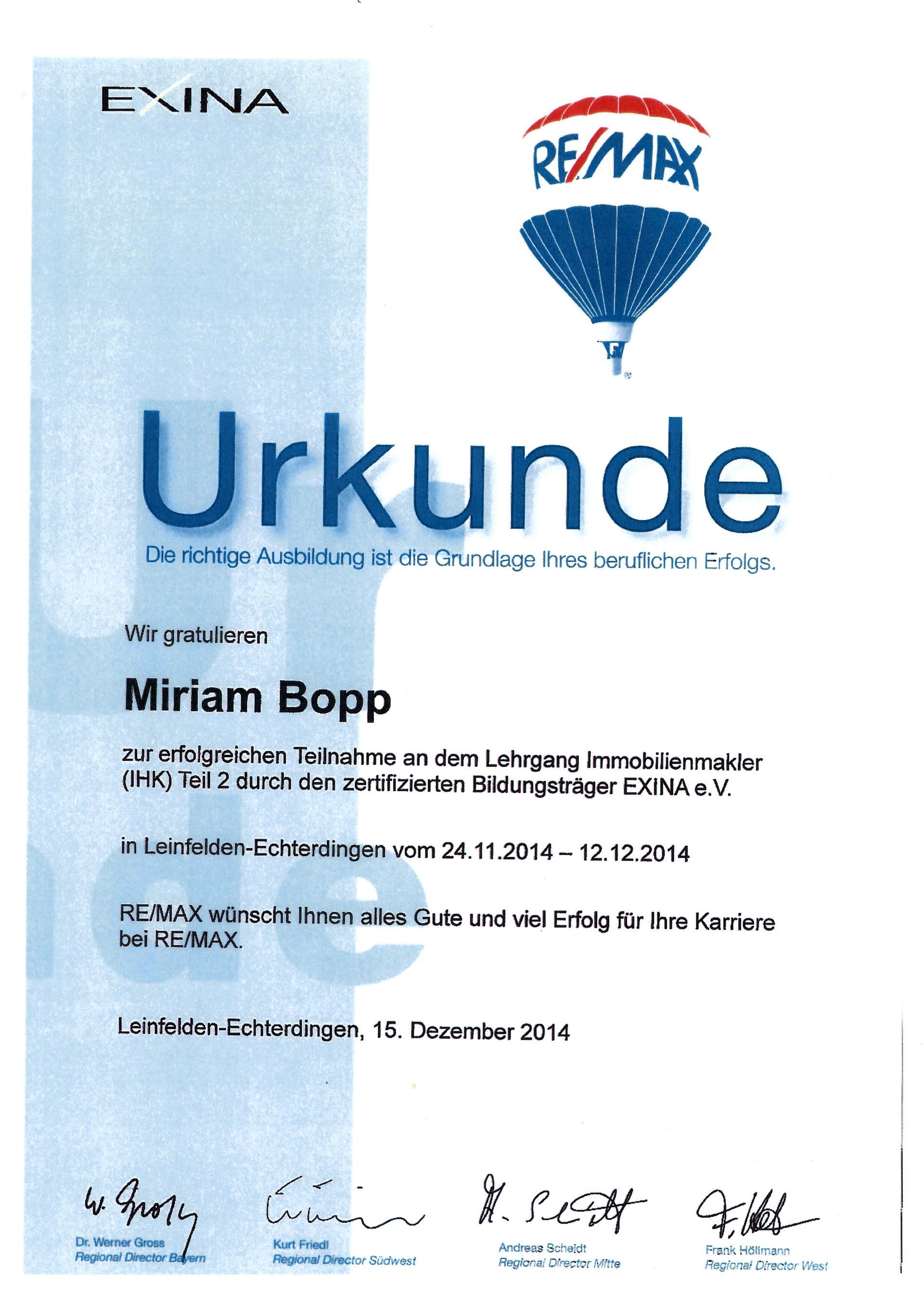 Miriam Bopp ist seit Anfang 2016 als selbstständige Immobilienmaklerin tätig.