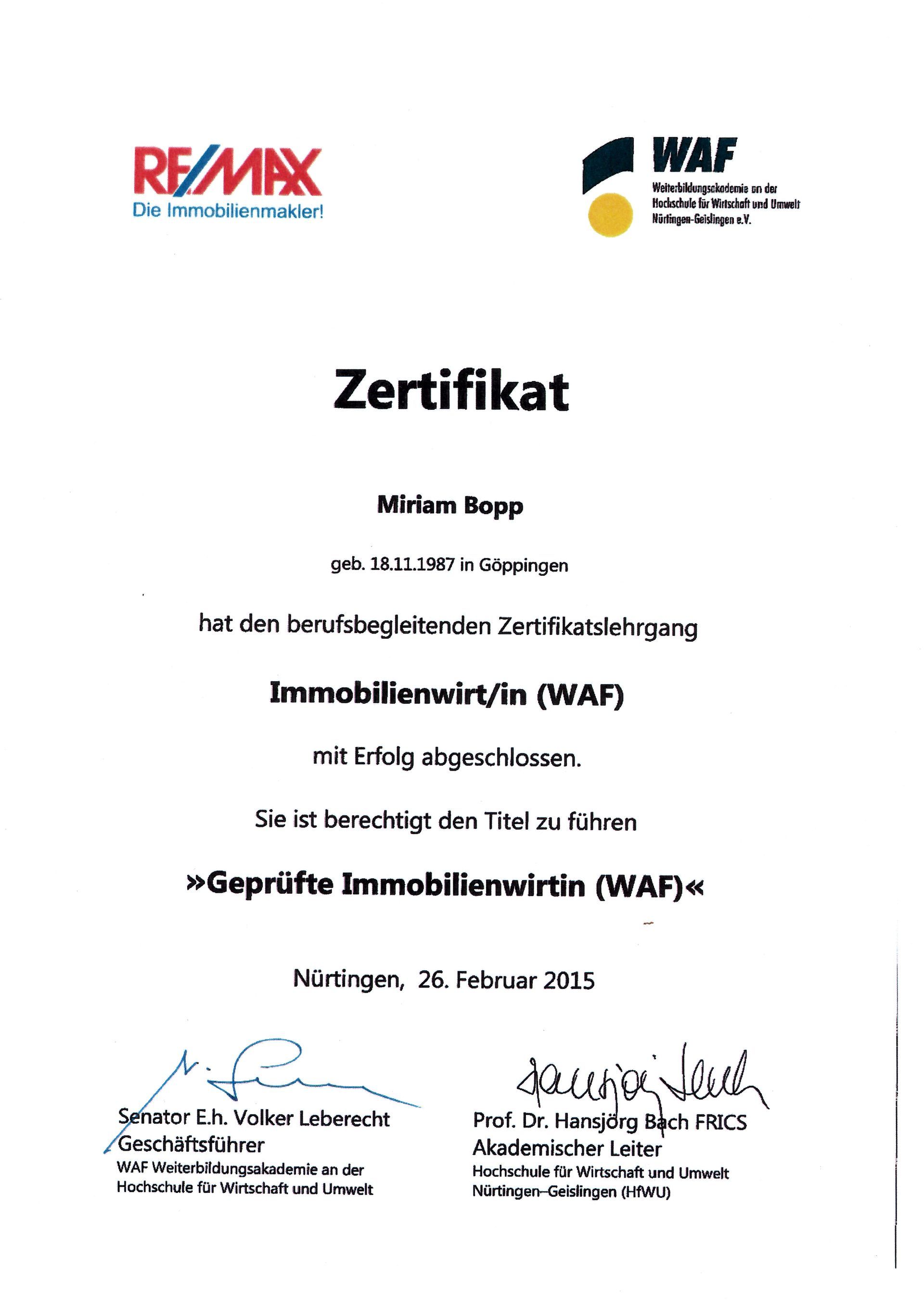 Bachelor of Arts, Immobilienwirtin (WAF)